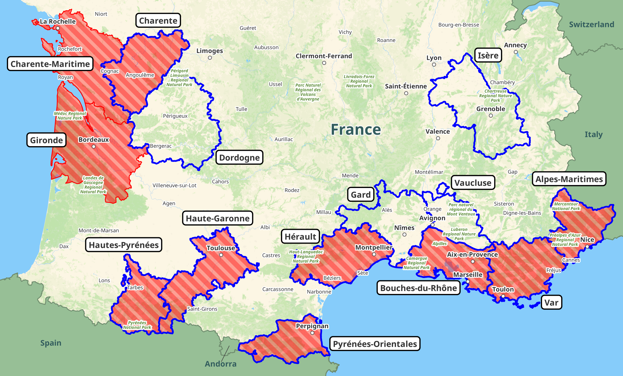 Donors who have visited the following departments (regions) of France, between 1st May and the 30th November, must have the WNV Donor Selection Guideline applied: